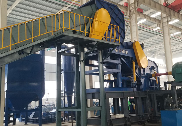 破碎線主機(jī)殼體采用特厚鋼板制造,內(nèi)襯為高錳鑄鋼件,可更換;主機(jī)轉(zhuǎn)子盤安裝于水平軸上,轉(zhuǎn)子盤圓周分布有銷軸,軸向懸有錘頭;主軸用滾珠軸承支撐,循環(huán)油強(qiáng)制潤滑冷卻,并裝有溫度傳感器;進(jìn)料口裝有液壓輥筒喂料裝置,位置一高一低,同向旋轉(zhuǎn),能將大件松散物料壓扁,送入破碎腔內(nèi)。