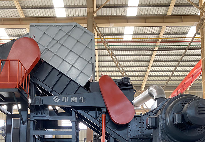 破碎線主機(jī)殼體采用特厚鋼板制造,內(nèi)襯為高錳鑄鋼件,可更換;主機(jī)轉(zhuǎn)子盤安裝于水平軸上,轉(zhuǎn)子盤圓周分布有銷軸,軸向懸有錘頭;主軸用滾珠軸承支撐,循環(huán)油強(qiáng)制潤滑冷卻,并裝有溫度傳感器;進(jìn)料口裝有液壓輥筒喂料裝置,位置一高一低,同向旋轉(zhuǎn),能將大件松散物料壓扁,送入破碎腔內(nèi)。